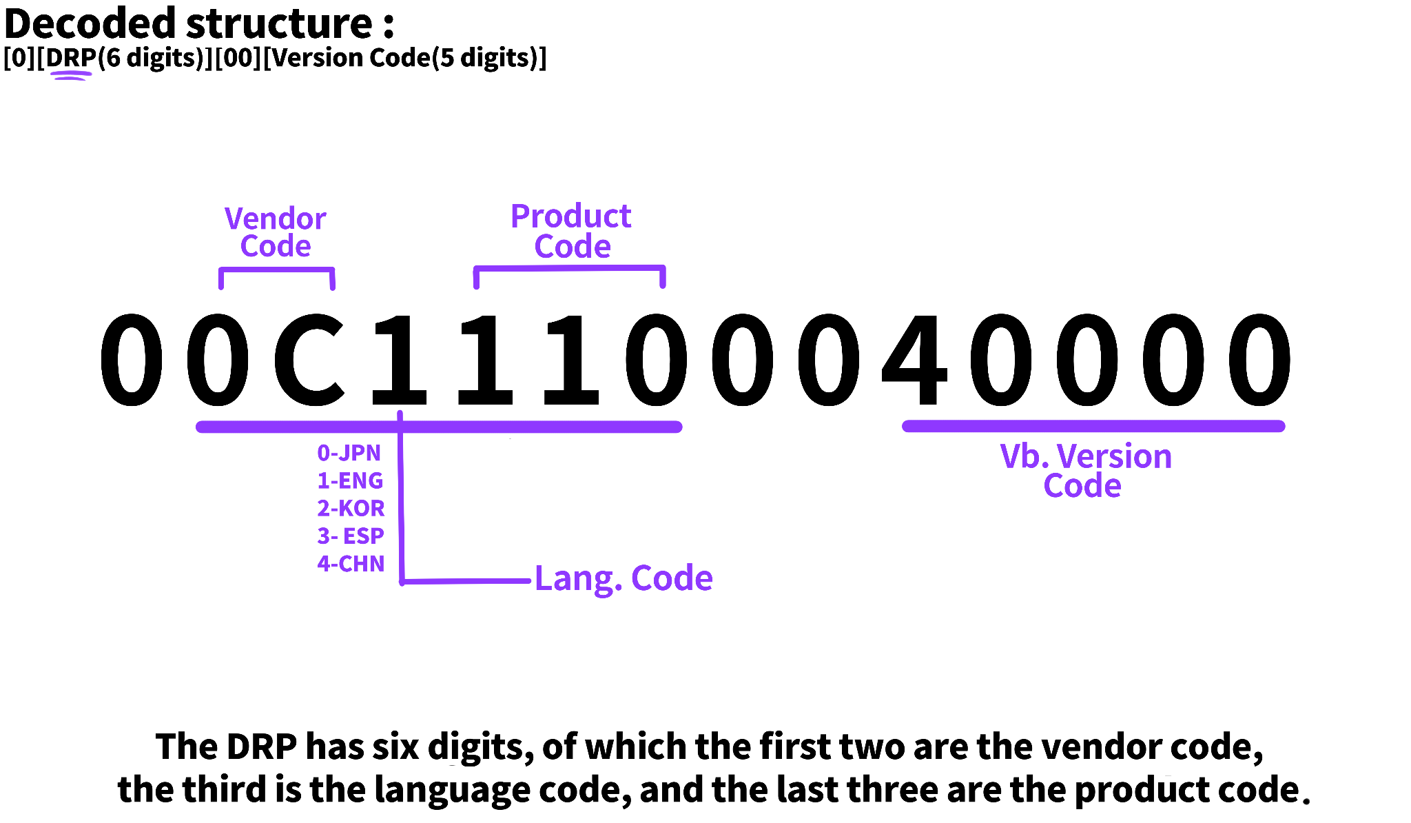 VOCALOID Component ID 是由14位数字组成的字符串,每一位都代表声库的不同信息,例如厂商编码、产品编码、语言编码和版本编码。※ 请参考下图以获得更清晰的理解。
