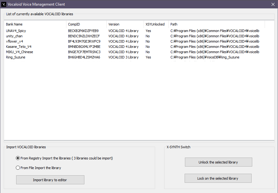 将打包好的声库(如果有的话,还需要安装程序)后,您可以使用Vocaloid 4 FE Plus的Voice Management将其加载到软件中。启动软件,通过File import(文件导入)找到声库,并可选择解锁XSY。